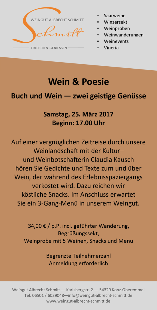 Freuen Sie sich auf einen wein-literarischen Erlebnisspaziergang durch die Oberemmeler Weinberge zum Frühlingsbeginn mit unserer Kultur- und Weinbotschafterin Claudia Kausch.