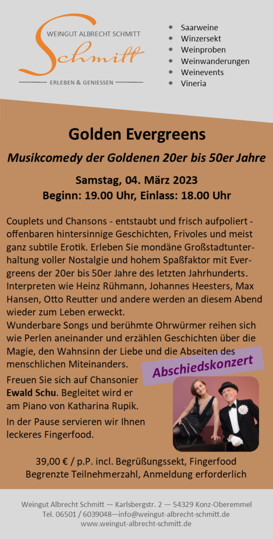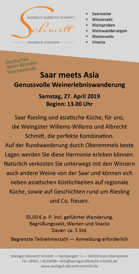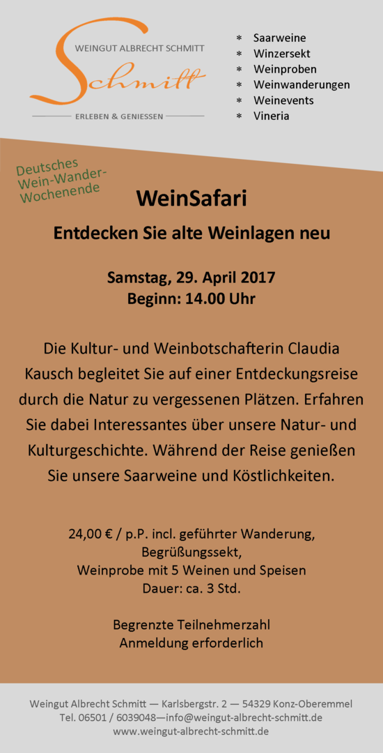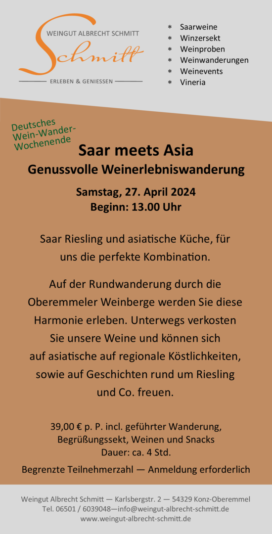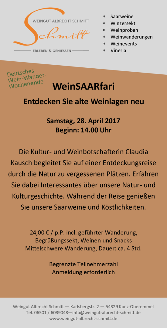 Die Kultur- und Weinbotschafterin Claudia Kausch und die Weingüter Alois Kirchen und Albrecht Schmitt laden zu einer Wanderung durch die Oberemmeler Weinlagen ein. Erfahren Sie dabei Interessantes über unsere Natur- uns Kulturgeschichte. Während der Wanderung genießen Sie unsere Saarweine dort, wo ihr Ursprung liegt. Abgestimmt auf die Weine werden regionale Köstlichkeiten gereicht.