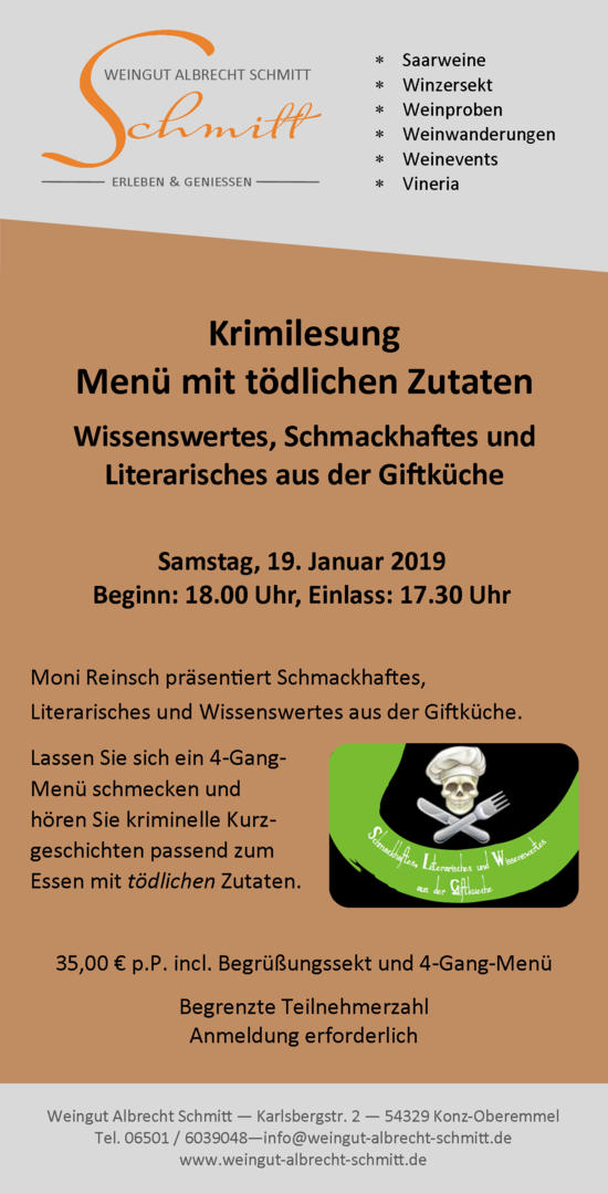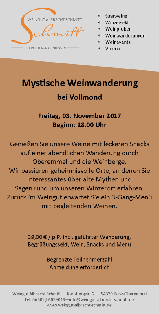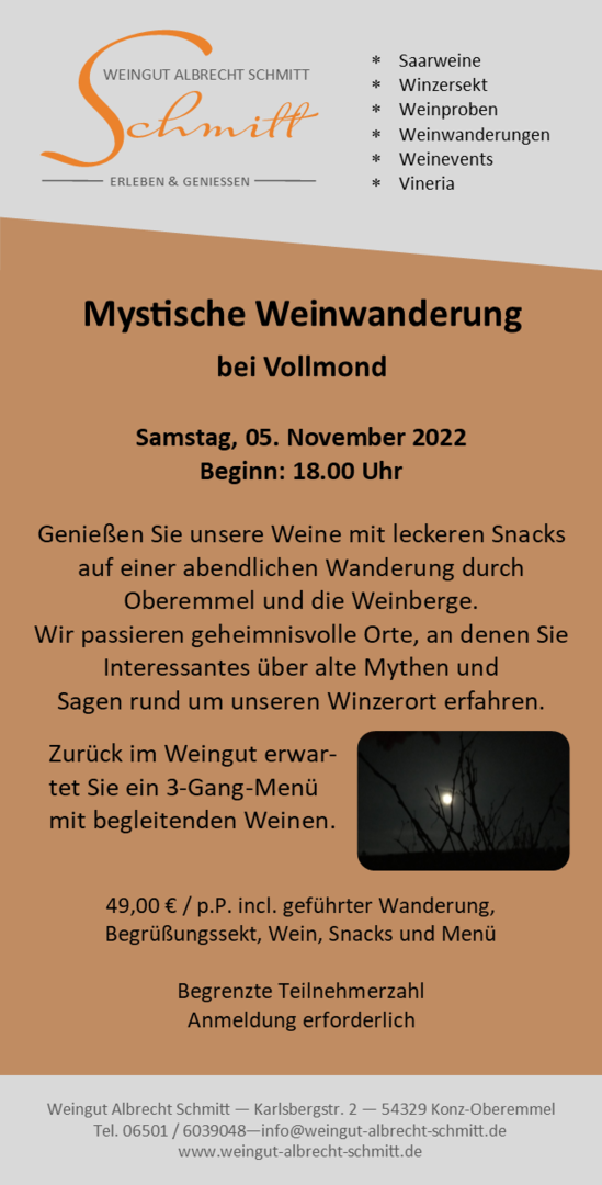 Genießen Sie unsere Weine mit korrespondierenden Speisen auf einer mystischen Wanderung durch Oberemmel und die Weinberge. Erfahren Sie Interessantes über Mythen und Sagen rund um Oberemmel von den Kultur- und Weinbotschaftern Claudia Kausch und Stefan Britz.